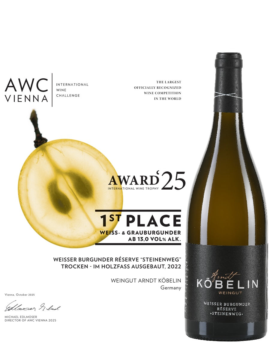 1. Platz AWC Vienna International Wine Challenge: 2022er Weißer Burgunder Réserve „Steinenweg“ von Arndt Köbelin in der Kategorie Weiß- & Grauburgunder ab 13,0 vol % Alkohol.